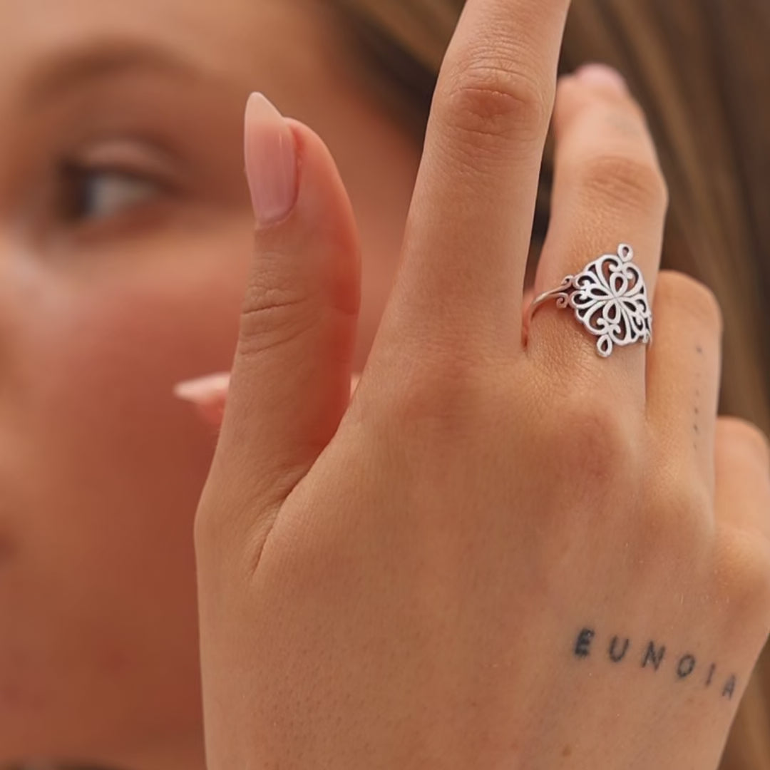 טבעת סופיה עשויה מכסף סטרלינג 925 בעבודת חיתוך עדינה ובעלת עיצוב פיליגרי מרשים בהשראת תכשיטים קלאסיים. דוגמת התחרה המיוחדת מעניקה לטבעת מראה יוקרתי ונשי, המתאים גם ליום-יום וגם לאירועים מיוחדים. שילוב מושלם של אלגנטיות ונוכחות.
