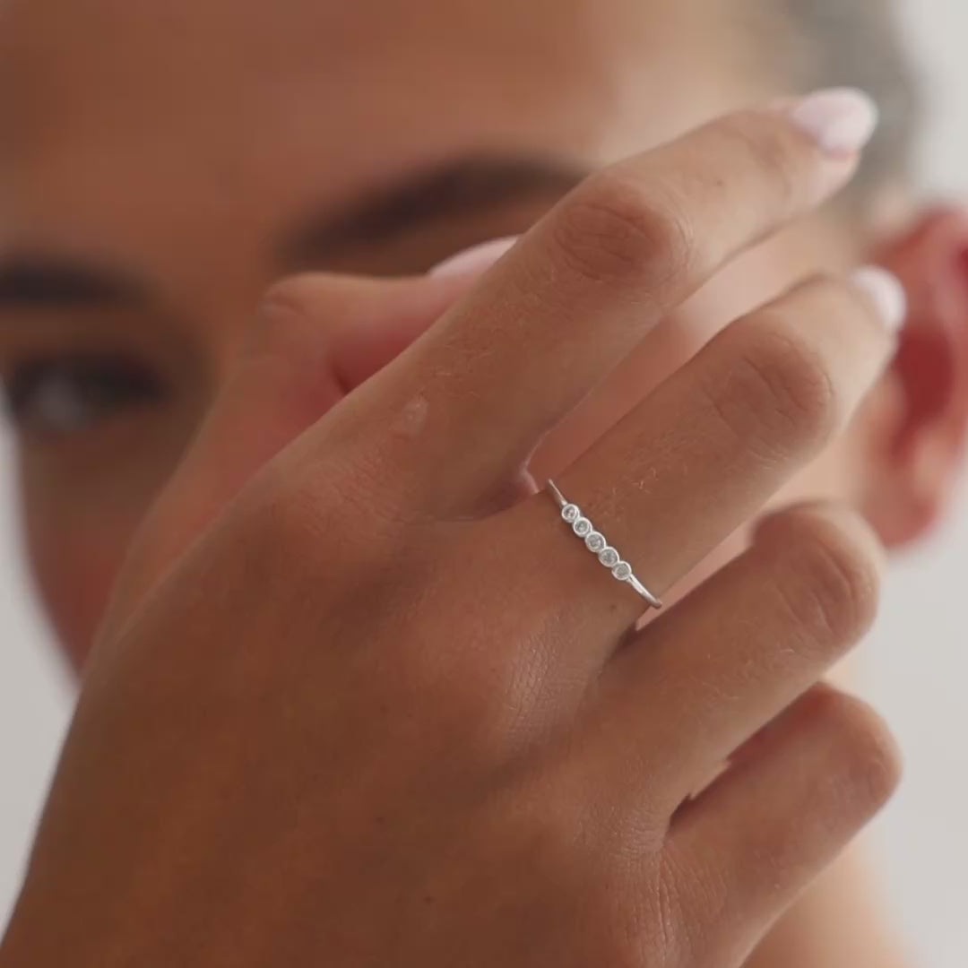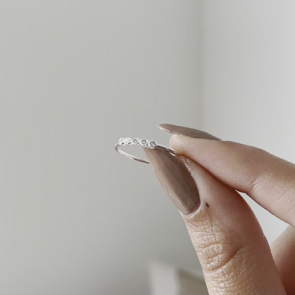 טבעת אניס כסף 925 בעיצוב מינימליסטי עם חמישה אבנים קטנות ונוצצות המסודרות בשורה עדינה. טבעת אלגנטית וקלאסית שמתאימה לשילוב עם טבעות נוספות או כפריט ייחודי בפני עצמו. תכשיט מושלם למראה יומיומי עם טאצ’ יוקרתי ומעודן.