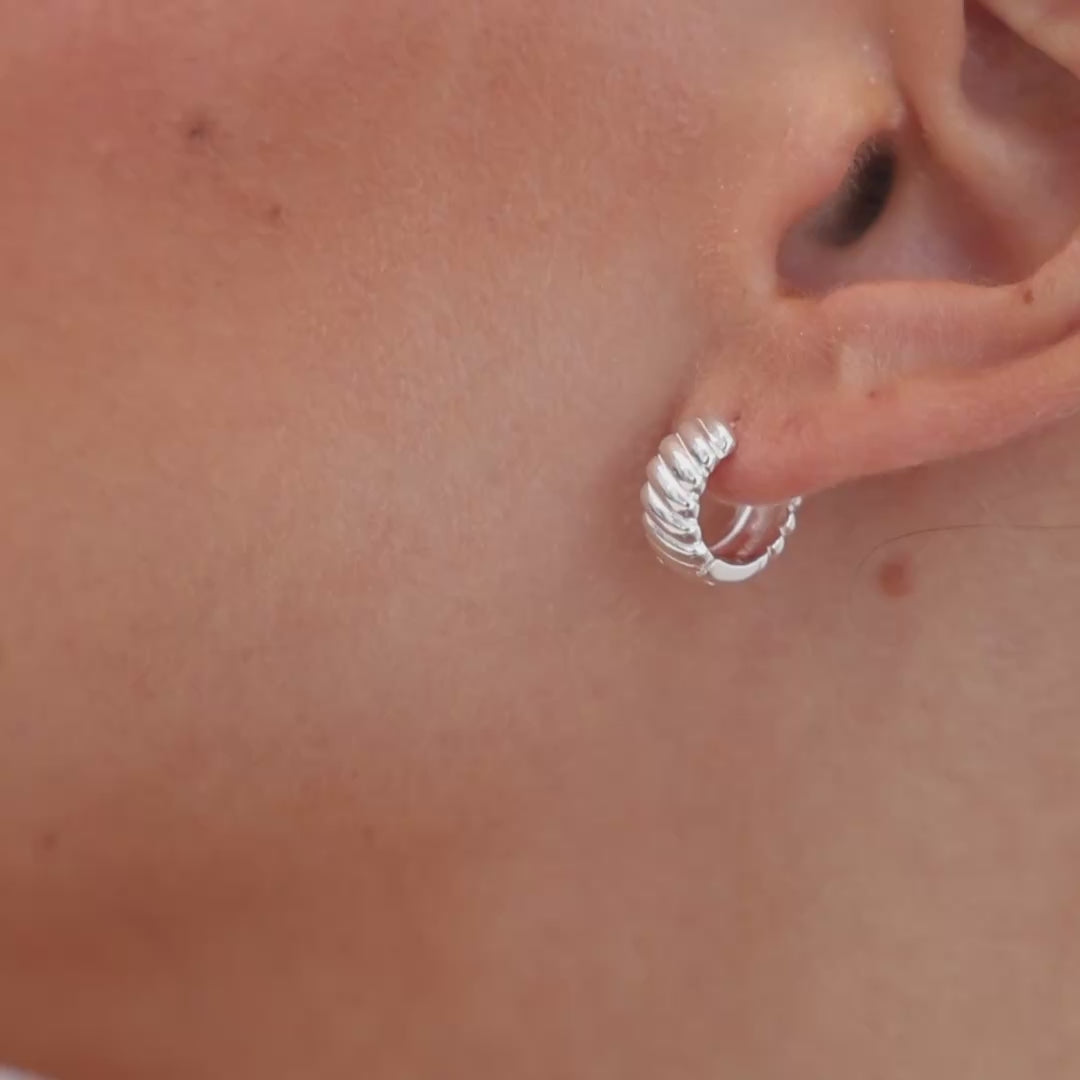 עגילי ריו כסף 925 בעיצוב חישוק עבה עם טקסטורה מחורצת מבריקה, המשדרים סטייל עכשווי ובולט. העגילים מעניקים נוכחות אופנתית ומתאימים לנשים שאוהבות תכשיטים עם עוצמה ואופי ייחודי. עשויים מכסף סטרלינג איכותי, היפואלרגניים ונוחים לענידה יומיומית וגם לערב מיוחד.