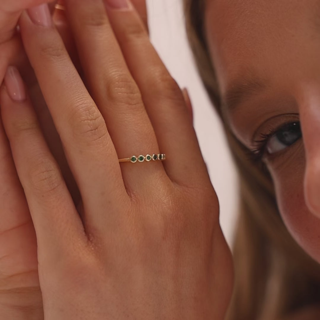טבעת עדינה במיוחד עם שורת אבנים ירוקות זוהרות המעניקות מראה יוקרתי ונקי.