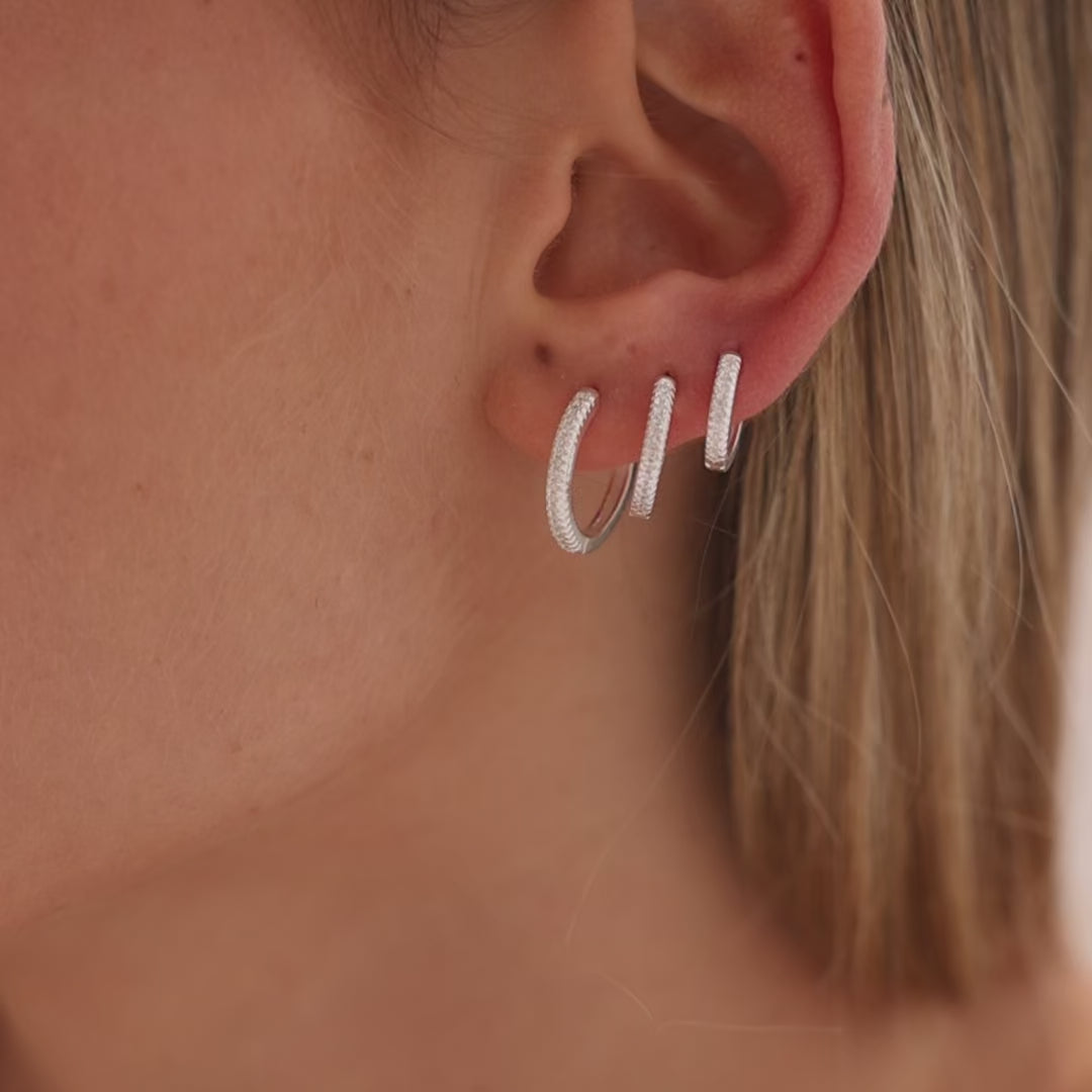 עגילי חישוק בגודל בינוני (15 מ״מ) בעיצוב קלאסי ונקי, משובצים בשורת זירקונים נוצצים לכל אורך החזית.