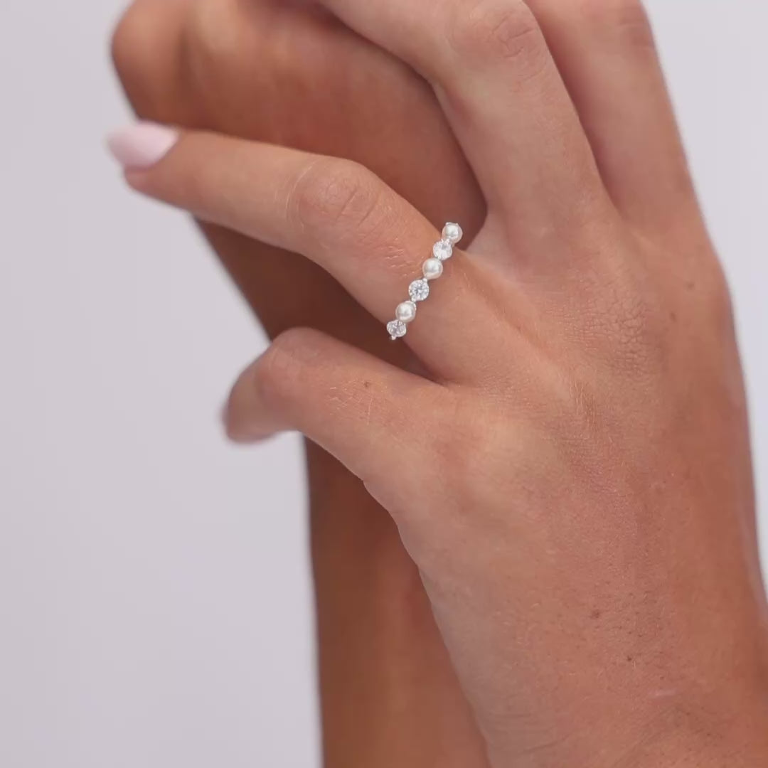 טבעת אמלין כסף 925 בעיצוב ייחודי עם שילוב של פנינים לבנות עדינות לצד זירקונים נוצצים. הטבעת משדרת איזון מושלם בין קלאסיות נשית לרעננות מודרנית, מתאימה לכל סגנון ולכל אירוע. עשויה מכסף סטרלינג איכותי, היפואלרגנית ונוחה לענידה יומיומית או חגיגית.